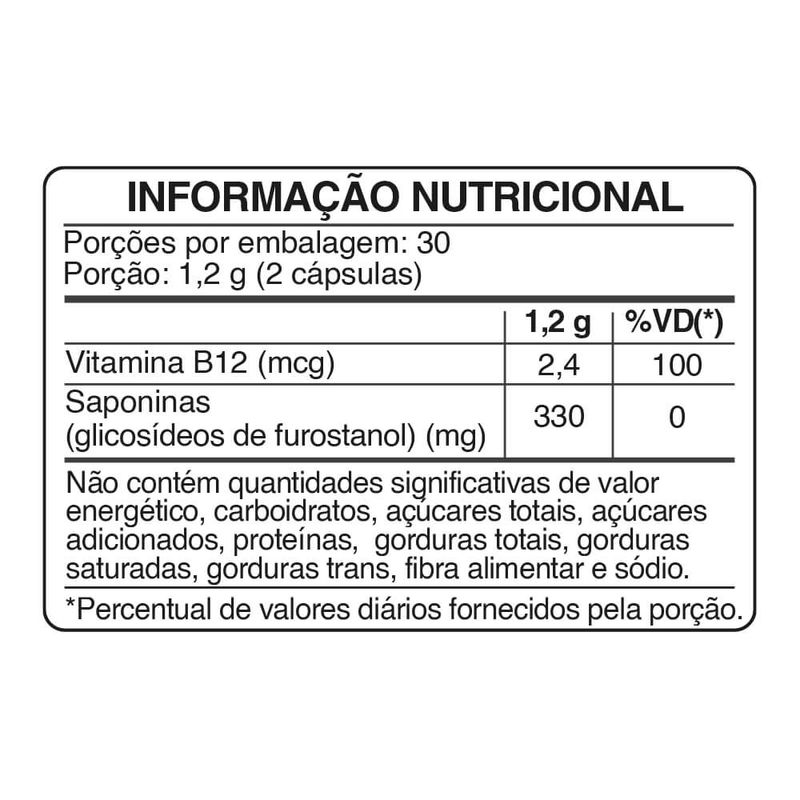 INGREDIENTES: Saponinas (Extrato de Semente de Feno Grego - Trigonella foenum-graecum L), Vitamina B12 (Cianocobalamina), Antiumectantes Silicato de Magnésio, Dióxido de Silício e Estearato de Magnésio.