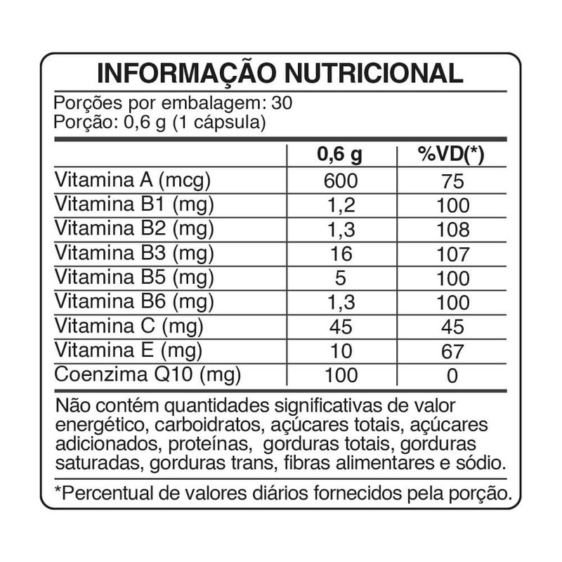 Coenzima Q10, Vitamina C (Ácido Ascórbico), Vitamina B3 (Niacina), Vitamina E (Acetato De DL-alfa-Tocoferol), Vitamina B5 (Pantotenato de Cálcio), Vitamina B2 (Riboflavina), Vitamina B6 (Cloridrato De Piridoxina), Vitamina B1 (Tiamina), Vitamina A (Acetato De Retinol), Antiumectantes Silicato de Magnésio, Estearato de Magnésio e Dióxido de Silício.