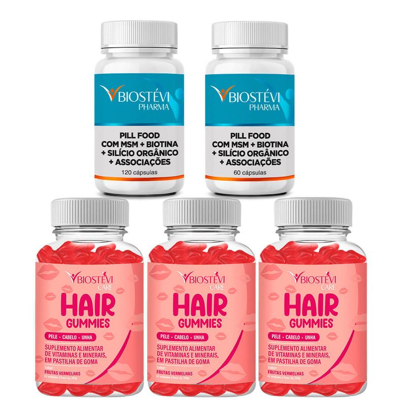 Hair Gummies + Pill Food Turbinado com Silicio Organico e MSM Biostevi e uma combinação perfeita para combater a queda de cabelo e mais. Confira já