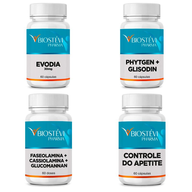 A Biostévi desenvolveu o Kit Natural Emagrecimento sem Treino, um conjunto de produtos para emagrecer, com uso de 30 dias. Composto por 1 pote de cada produto, o Kit reúne Evodia, Phytgen+Glisodin, Faseolamina+Cassiolamina+Glucomannan e Controle de apetite, manipulados muito recomendados e procurados, por auxiliar no emagrecimento saudável.