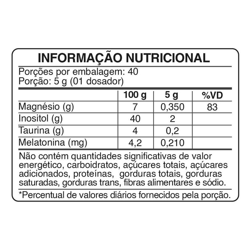 INGREDIENTES: Inositol (Mio-inositol/Mesoinositol), Bisglicinato de Magnésio, Taurina, Melatonina, Aroma idêntico ao natural de Maracujá, Maltodextrina, Antiumectante INS 551, Acidulante INS 330, Edulcorante INS 955 e corante artificial: tartrazina (INS 102) 90%.