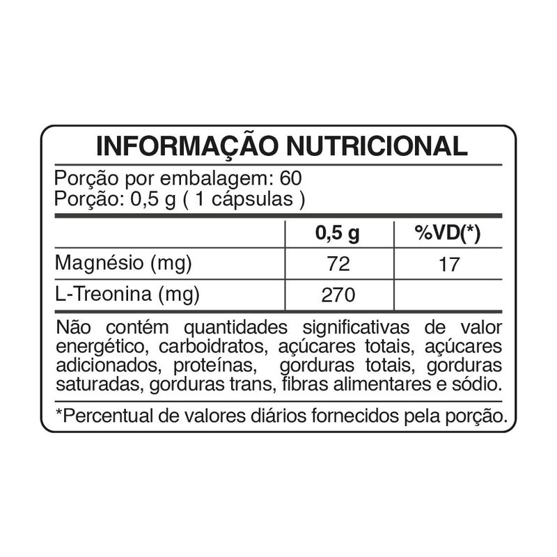 L-treonina, Óxido de Magnésio e Antiumectante dióxido de silício. COMPOSIÇÃO CÁPSULA: Gelificante gelatina.